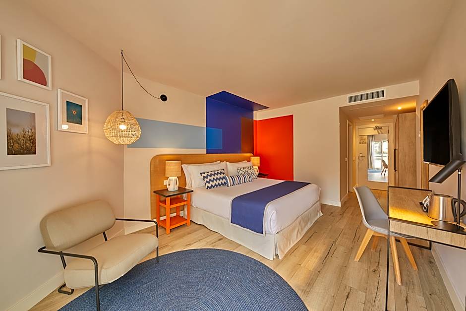 JUNIOR SUITE PREFERRED CLUB POOL VIEW 3 AD + 1 CH is 344 square feet and includes a king-size bed 150-183 width plus a sofa bed plus balcony, desk, satellite tv , hairdryer, tea and coffee making facilities , safe, bathrobes, and slippers.